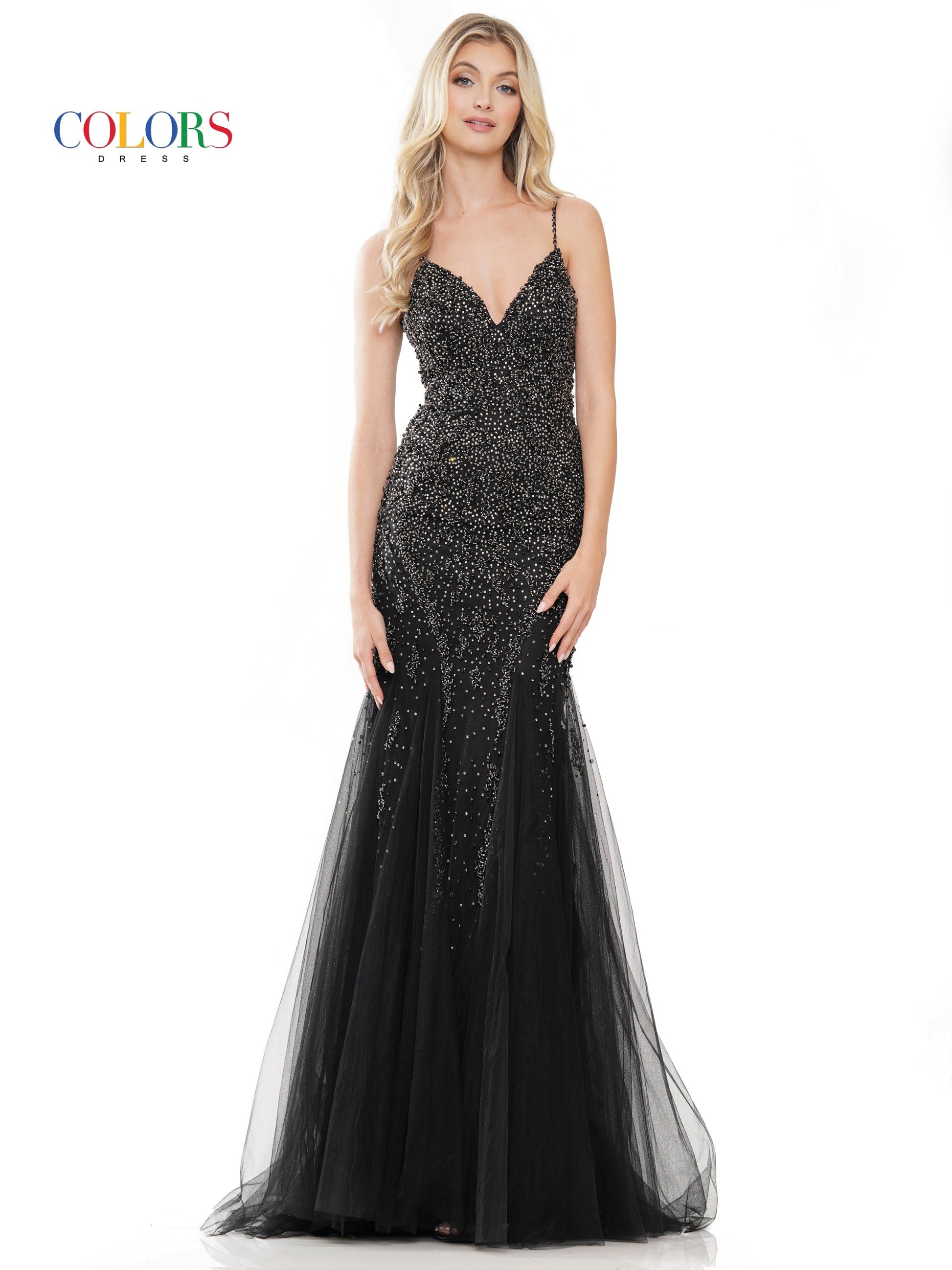 With our Colors 3135 Long Fitted Spaghetti Strap Prom Dress. you may seem elegant. The gorgeous beaded mesh and V neck combine to produce an alluring appearance. The attractive fit and flare silhouette is enhanced with a sophisticated touch by the elegant V back design. Glow brightly on this unique evening!