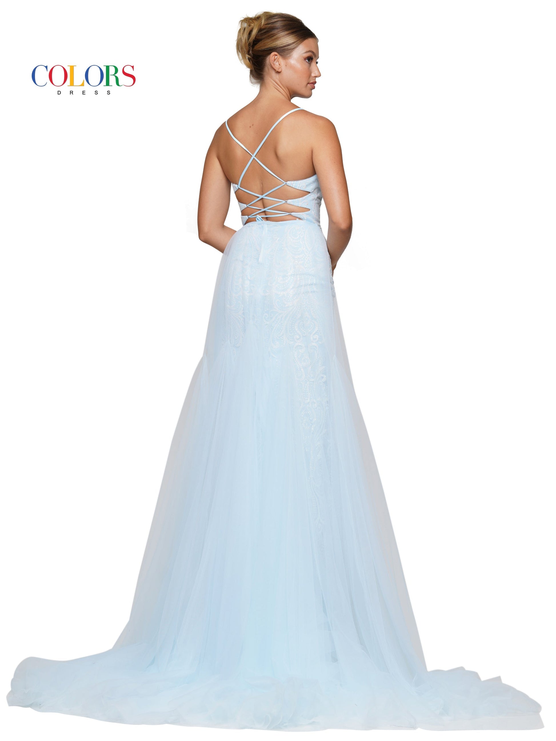 With this stunning Colors 3140 Long Formal Glitter Mesh Prom Dress. you'll be sure to turn heads! An alluring combination of glamor and charm is brought about by the sensual high slit. captivating corset back. and shimmering mesh. This dress is made to accentuate your own style. so it will make you feel attractive and confident on this important night. Take advantage of the magic and create lifelong memories!